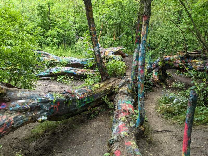 “The tree is most easily accessed if one parks in the lot directly adjacent from the Greenspire School, the address of which is 1026 Red Dr, Traverse City, MI 49684. From the trailhead, take the first right and you will proceed up a large hill into a clearing. The next left will lead you down to the Hippie Tree. You should see some painted limbs from the outside, and some past visitors have painted markers to follow along the trail.”