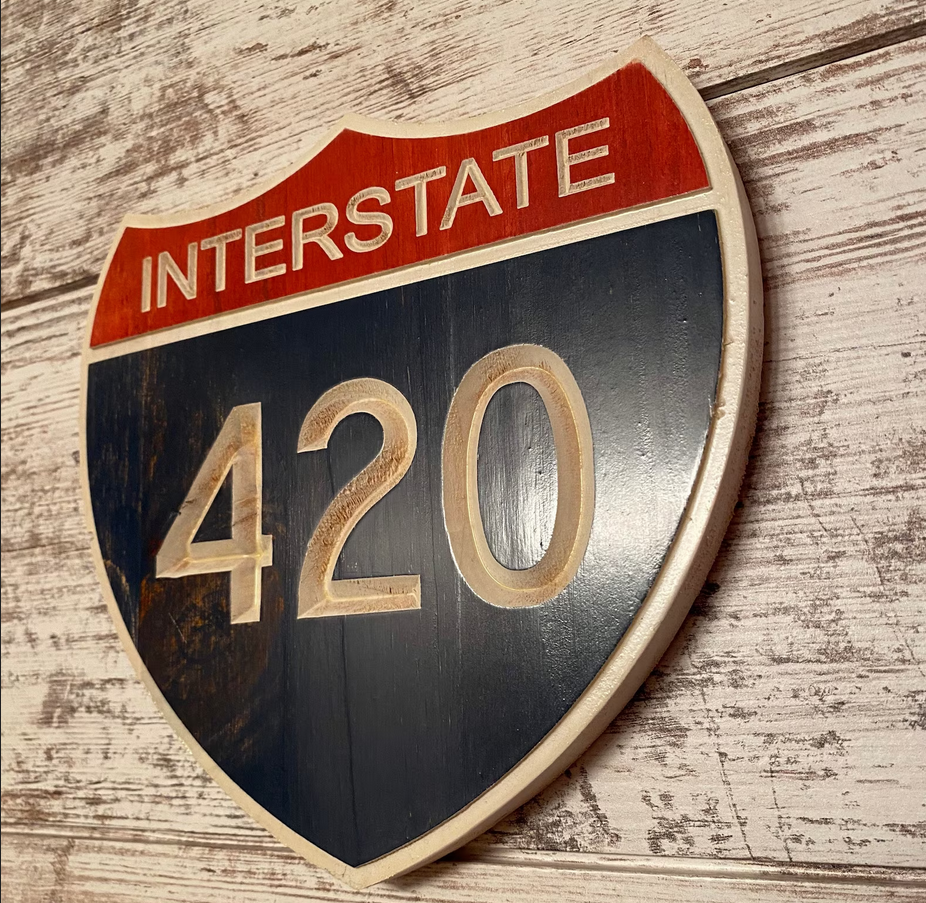 The ultimate addition to a Michigan road trip lover’s home, the carved Interstate 420 Shield Wood Highway Sign is a perfect gift choice. This beautifully handmade marijuana-themed wall hanging adds a unique touch to any smoke lounge, she-shack, or man cave.
