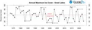 As much of the Great Lakes region experiences its warmest winter on record, and more record high temperatures are expected in Michigan, the National Oceanic and Atmospheric Administration (NOAA) has reported record low levels of ice coverage on the Great Lakes, amid a steady, decades-long decrease in coverage.