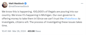 Despite the criticism and a community note from X noting his error, Rep. Maddock posted later on Thursday morning: “We know this is happening. 100,000’s of illegals are pouring into our country. We know it’s happening in Michigan. Our own governor is offering money to take them in! Since we can’t trust the #FakeNews to investigate, citizens will. The process of investigating these issues takes time.”
