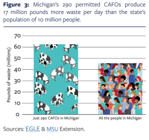 As of 2012, concentrated animal feeding operations generated more than 20 times the amount of fecal wet mass produced by all of the nation’s humans. In Michigan, permitted large scale feeding operations produced more than 17 million more pounds a day than the state’s 10 million person population, the report said.