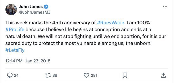 “I am 100% #ProLife because I believe life begins at conception and ends at a natural death. We will not stop fighting until we end abortion, for it is our sacred duty to protect the most vulnerable among us; the unborn,” James posted to his Twitter account in January 2018.