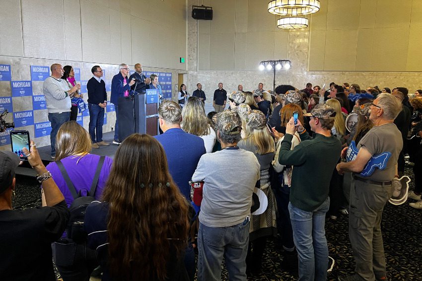 The bus tour began on Monday and included a few stops in Wisconsin before rolling into Kalamazoo, Flint, Midland, Saginaw, and East Lansing—with additional stops scheduled in Muskegon, Grand Rapids, and Jackson this week, before it concludes in Pennsylvania.