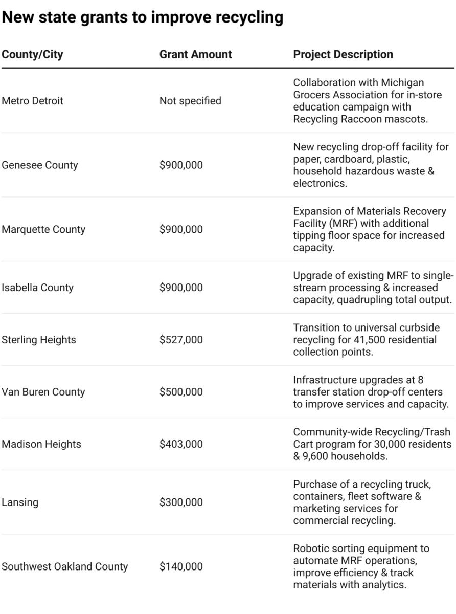 The state department aims to further expand recycling access with over $5 million in new grants to support projects in Metro Detroit, Genesee County, Lansing, Southwest Oakland County, Isabella County, Van Buren County, Marquette County, Sterling Heights and Madison Heights.