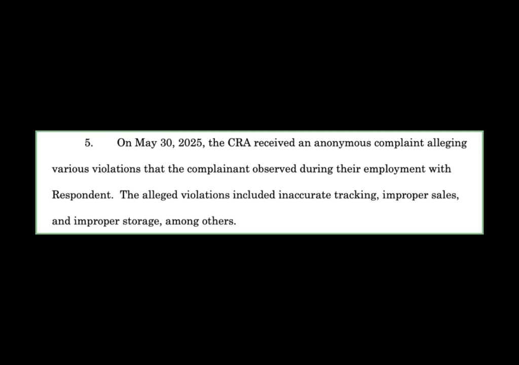 The anonymous tip—and subsequent investigation—became the backbone of an eight-count complaint the Cannabis Regulatory Agency filed on Oct. 24 against the company.
