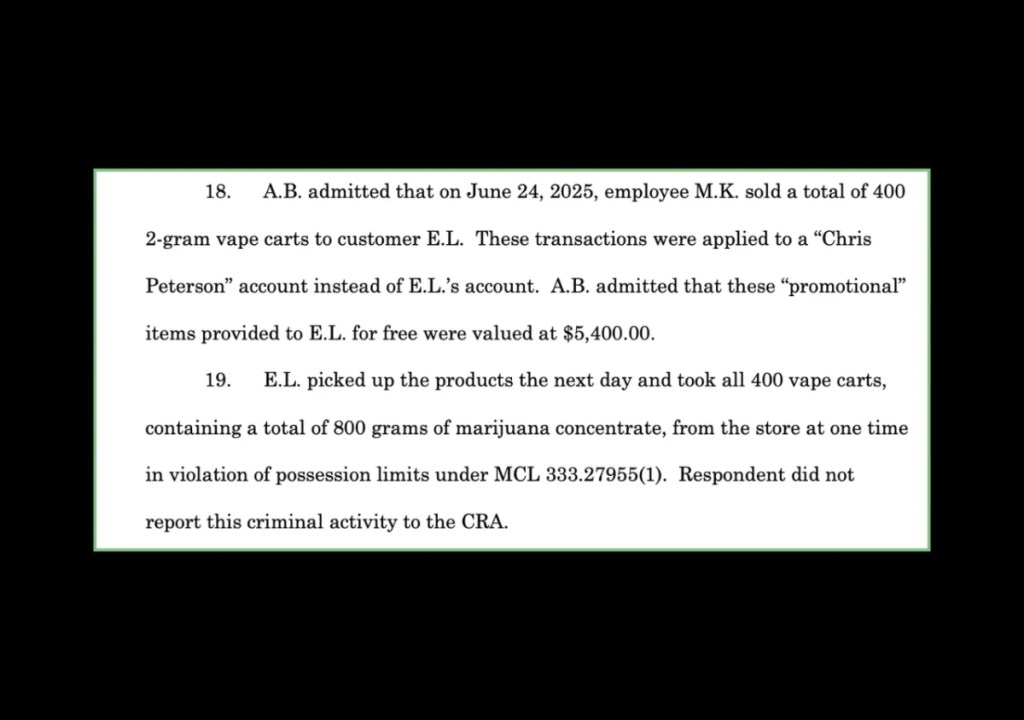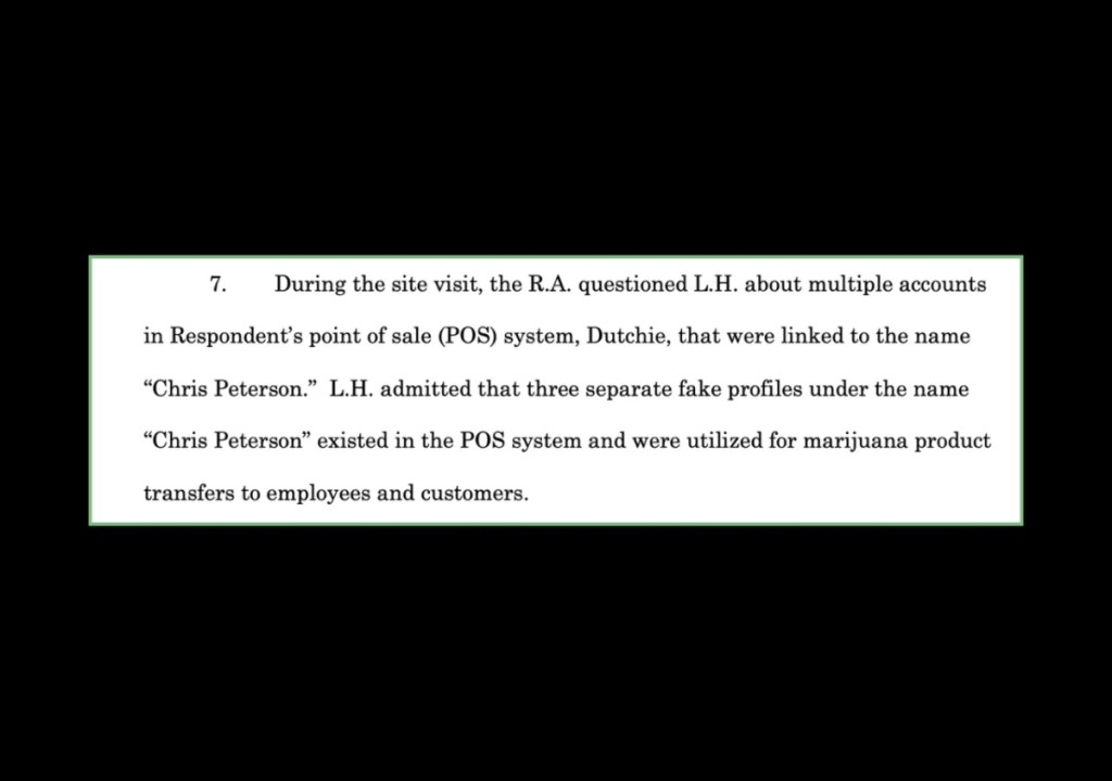 State regulators also reviewed the store’s sales data and confirmed two massive transactions linked to the fake “Chris Peterson” profile—both of which, the complaint alleges, resulted in customers leaving the dispensary with felony-level quantities of cannabis concentrates.