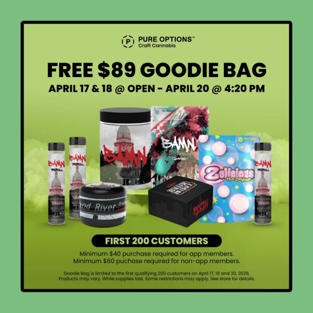 Pure Options is handing out free $89 goodie bags to the first 200 customers at its six Michigan locations on April 17, 18, and 20. The only catch? You’ll need to hit a minimum purchase of $40 or $60—and you’ll probably need to arrive before 10 a.m. or they’ll already be gone.