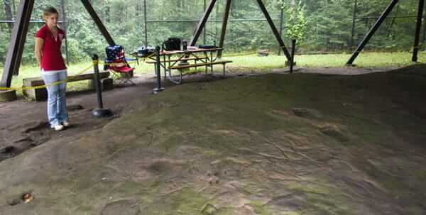 As the path widens into a clearing, you’ll come to a wood pavilion. A tall chain link fence surrounds the structure, and behind it is a slab of sandstone. Scattered across the stone are the carvings.