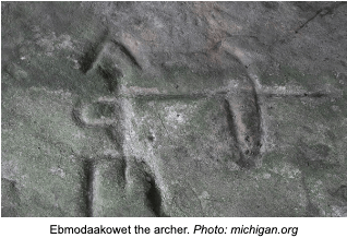 But one figure stands out in the narrative. A person who almost seems to be looking straight at the viewer, despite aiming a bow and arrow into the distance. This is Ebmodaakowet. His arrow is knowledge, and he’s shooting it into the future.