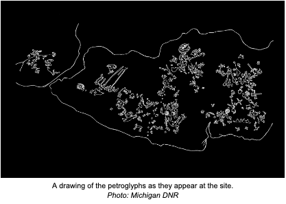 A petroglyph is a carving made in stone. Humans have been making them for thousands of years, all over the world. The oldest petroglyphs in North America, at Nevada’s Winnemucca Lake, are between 10,500 and 14,800 years old—making them three times older than the Egyptian pyramids. Here in Michigan, the Sanilac Petroglyphs are probably closer to 1,000 years old, made well before the Columbian era.