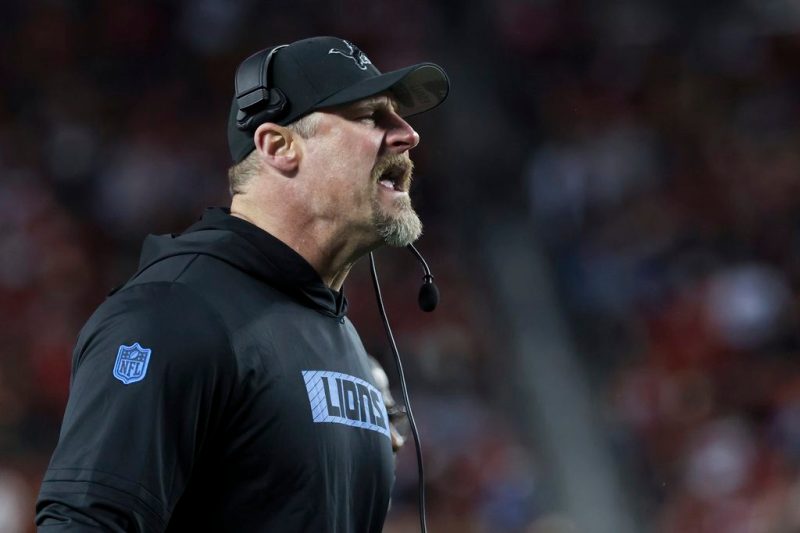 Detroit Lions head coach Dan Campbell yells from the sideline during the first half of an NFL football game against the San Francisco 49ers, Monday, Dec. 30, 2024, in Santa Clara, Calif. (AP Photo/Jed Jacobsohn)