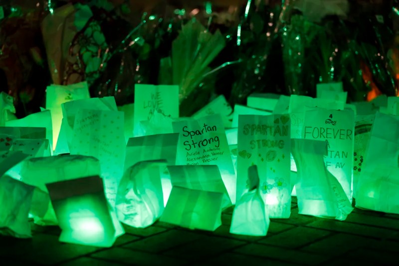 MICHIGAN—Michigan State University students held on to each other Tuesday night as they laid flowers around campus and illuminated green luminaries to remember everything the East Lansing campus lost a year ago.