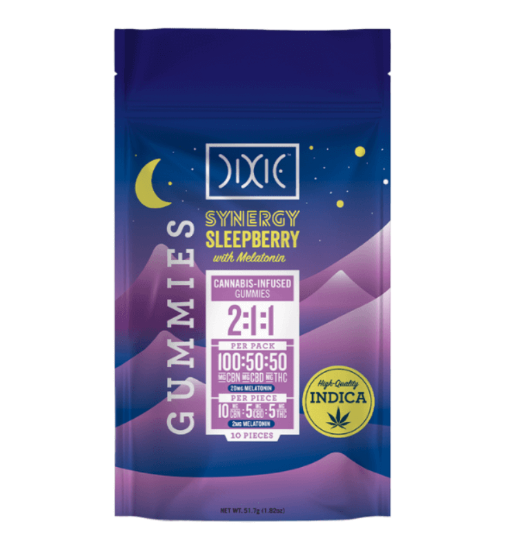 Dixie Synergy Sleepberry gummies are designed as a bedtime lullaby that offers 5 mg of CBD and another 5 mg of THC—with the main star being CBN (a cannabis compound that can be compared to a weaker THC) at 10 mg. These treats help with tissue and muscle health, as well as gentle sedation.