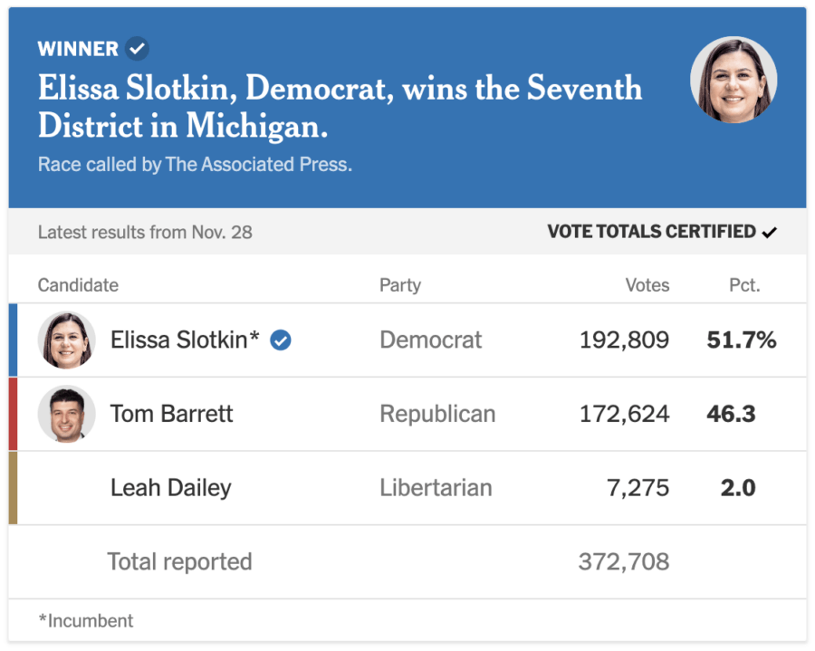 Last year’s race between Slotkin and Barrett was initially expected to be a tight one, but as election night rolled around, Slotkin won handily, beating Barrett by about 20,000 votes.