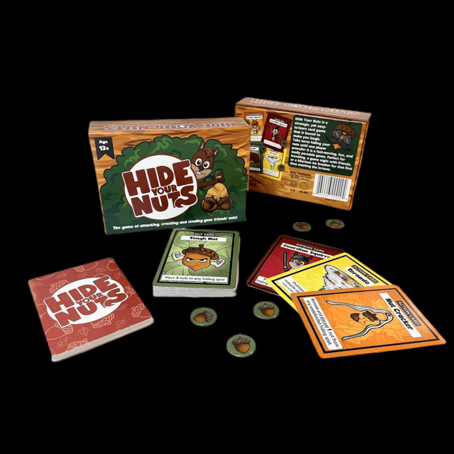 Hide Your Nuts is a game meant for older children and adults, with plenty of adult humor and puns. Players portray squirrels and play cards each turn that will hide their nuts, protect their nuts in play, or act against other players. The first player to hide all their nuts wins the game.