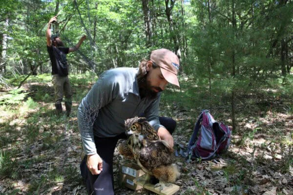 Zachary Bordner prepares a robotic great horned owl used to lure merlins for capture so they can be banded and fitted with tracking devices on June 27, 2022, near Glen Arbor. (AP Photo/John Flesher)