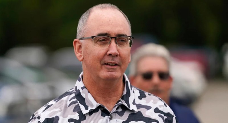 United Auto Workers President Shawn Fain talks with members picketing near a General Motors Assembly Plant in Delta Township, on Sept. 29. (AP Photo/Paul Sancya, File)