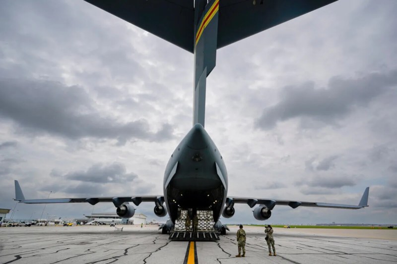 The crew of an Air Force C-17 begins to unload a plane load of baby formula at the Indianapolis International Airport in Indianapolis, Sunday, May 22, 2022. (AP Photo/Michael Conroy)