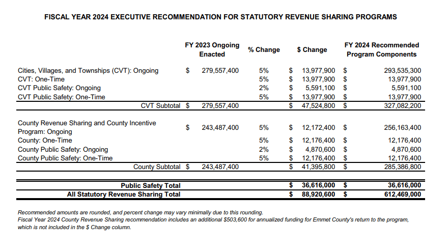 Whitmer’s $79 billion budget proposal, her fifth in office, recommends a significant increase totaling 10% in statutory revenue sharing payments in Fiscal Year 2024 as compared to the current fiscal year that ends in October.