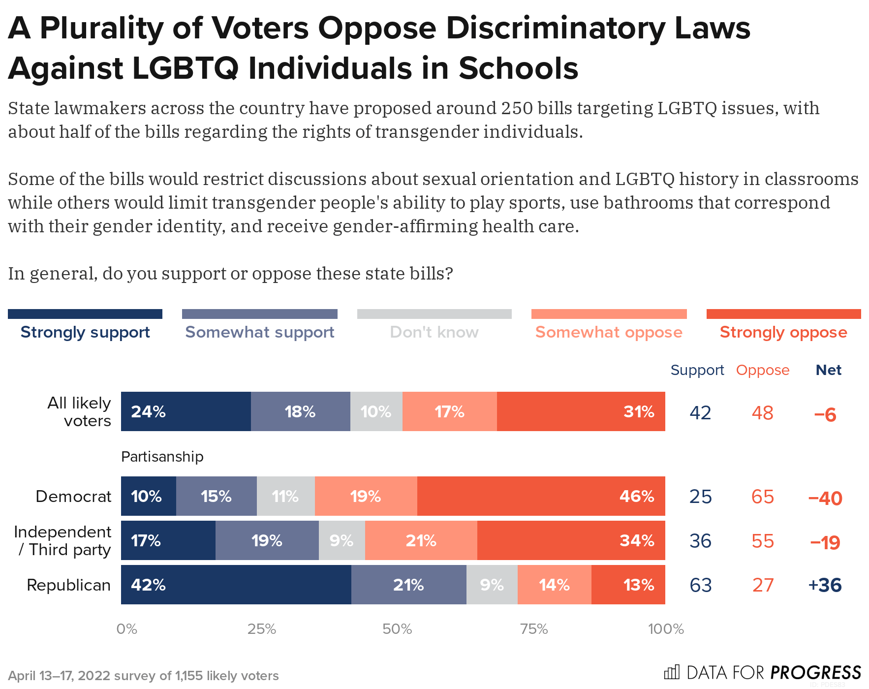 While voters narrowly oppose these anti-LGBTQ proposals, most have heard little about them. Only 28% said they had heard “a lot” about the proposed bills, with 72% saying they’d heard a “little” or “nothing at all.”