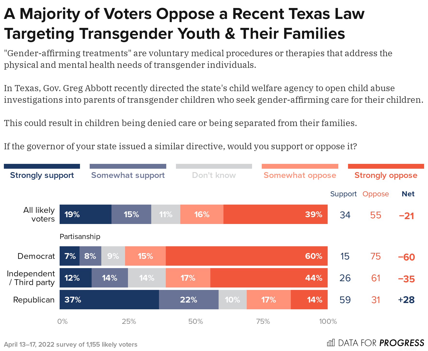 Voters also oppose Texas. Gov. Greg Abbott’s recent directive ordering the state’s child welfare agency to open child abuse investigations into parents of transgender children who seek gender-affirming care for their children. LGBTQ Advocates have warned that Abbott’s directive could lead to transgender youth being placed in foster care and see their parents criminally charged with child abuse.