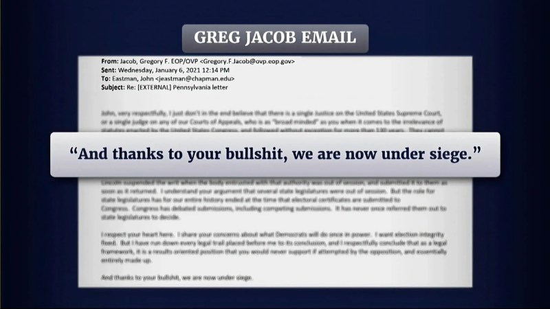 Jacob also testified that after the riot was over and Congress was back in session to certify the results, Eastman emailed him to again ask that Pence send the votes back to the states.