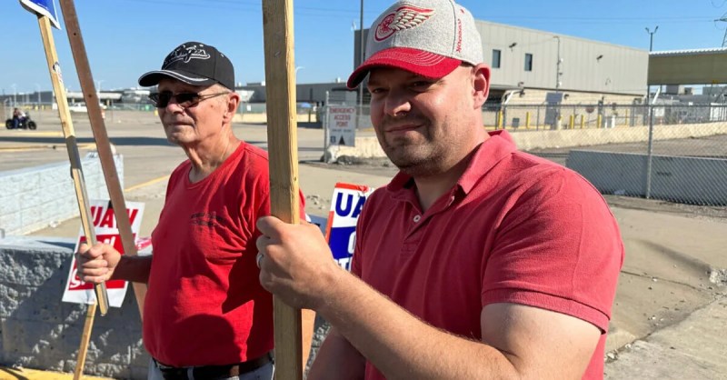 Striking United Auto Workers member Chris Jedrzejek, right, and his father picket outside Ford Motor Co.'s Michigan Assembly Plant on Oct. 2 in Wayne. (AP Photo/Mike Householder)