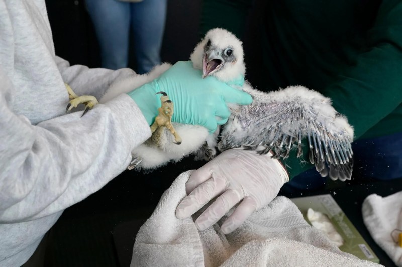 Moments earlier, Fedewa and Jim Schneider with the university’s Department of Fisheries and Wildlife journeyed up to the roof to retrieve the chicks despite their parents — Freyja and Apollo — angrily screeching and hovering above. They were named in a Twitter contest, and a Michigan elementary school decided on the chicks’ monikers.