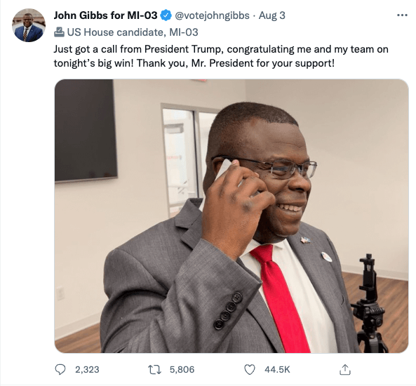 In the fall of 2021, Gibbs announced his candidacy for Michigan’s 3rd congressional district. A few days later, he received Trump’s endorsement. On Aug. 2, he beat Meijer in the state’s Primary Election.