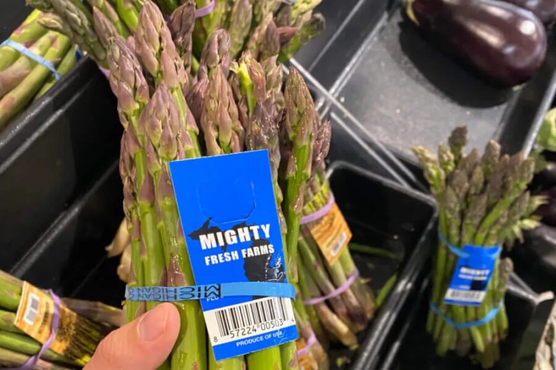 First, check for a purple band around the asparagus that may indicate if it’s a product of Michigan or another part of the US. Adams says you can ask your local retailer to confirm its origin if you don’t see those labels.