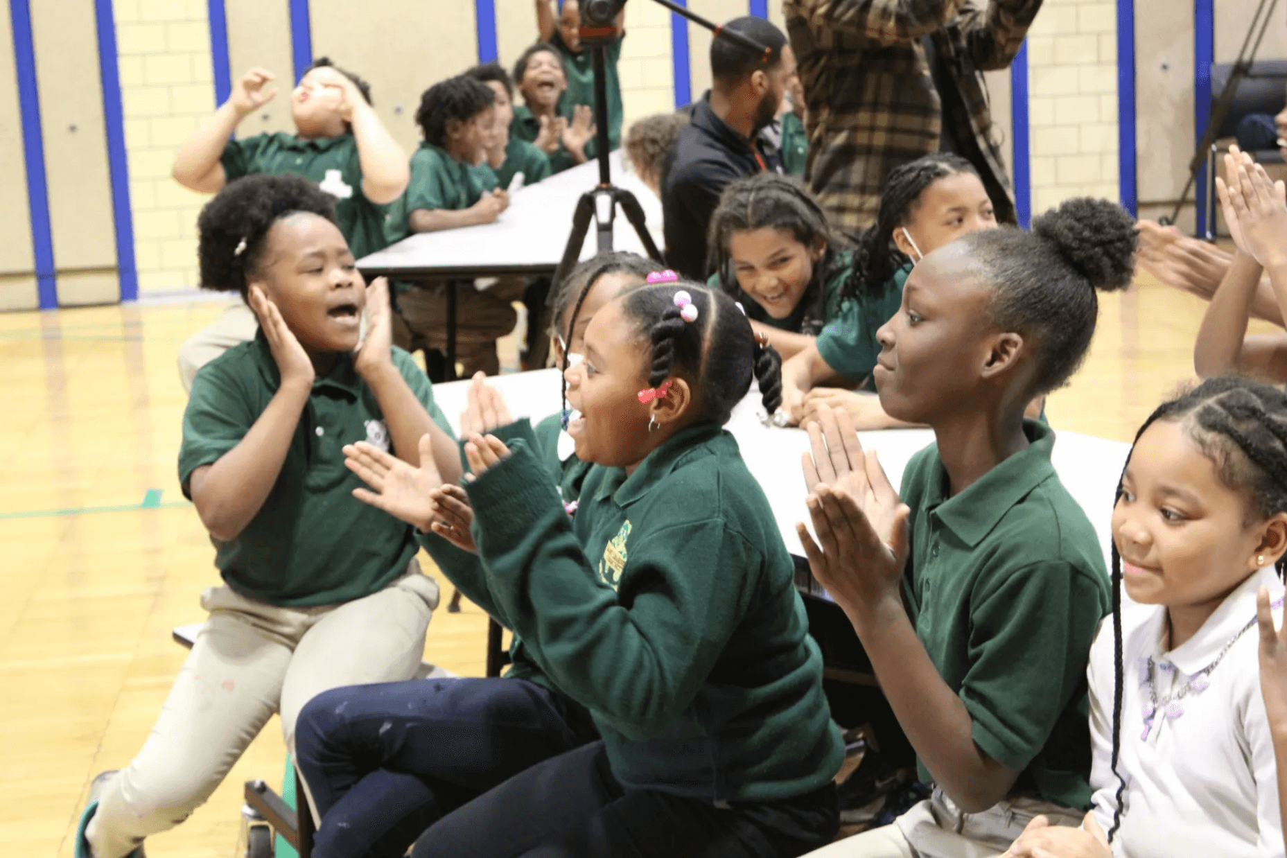 Back at her classroom, the excitement and cheers continued as Jackson and Rice fielded questions from students. “I have the largest class in the building,” Jackson said of her 34-student classroom. “The largest and the best.”