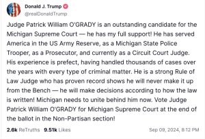 “Judge Patrick William O’Grady is an outstanding candidate for the Michigan Supreme Court — he has my full support,” Trump posted on social media this week. “He is a strong Rule of Law Judge who has proven record (sic) shows he will never make it up from the Bench — he will make decisions according to how the law is written! Michigan needs to unite behind him now.”