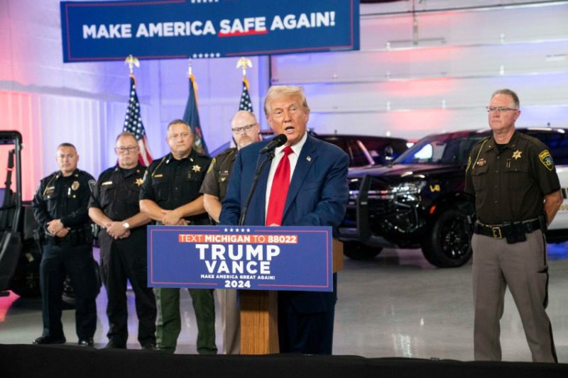 Livingston County Sheriff Mike Murphy, other police officers, as well as their vehicles, were positioned behind Trump during his speech—along with an array of “Make America Safe Again” campaign signs. Afterwards, Trump only took one question from reporters, despite insistence from Murphy that this week’s event was to be a “press conference” and not a political event.