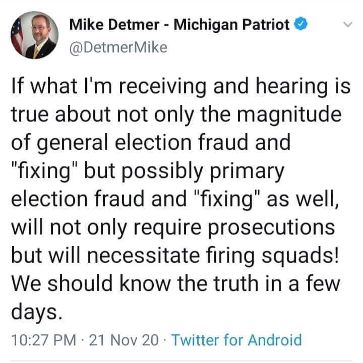 - Mike Detmer previously said that people guilty of committing nonexistent fraud during the 2020 election should be killed via firing squad.