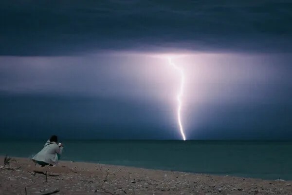 A woman takes a photo of lightning striking as dark storm clouds roll over Lake Michigan. (Mark Olsen via Unsplash)