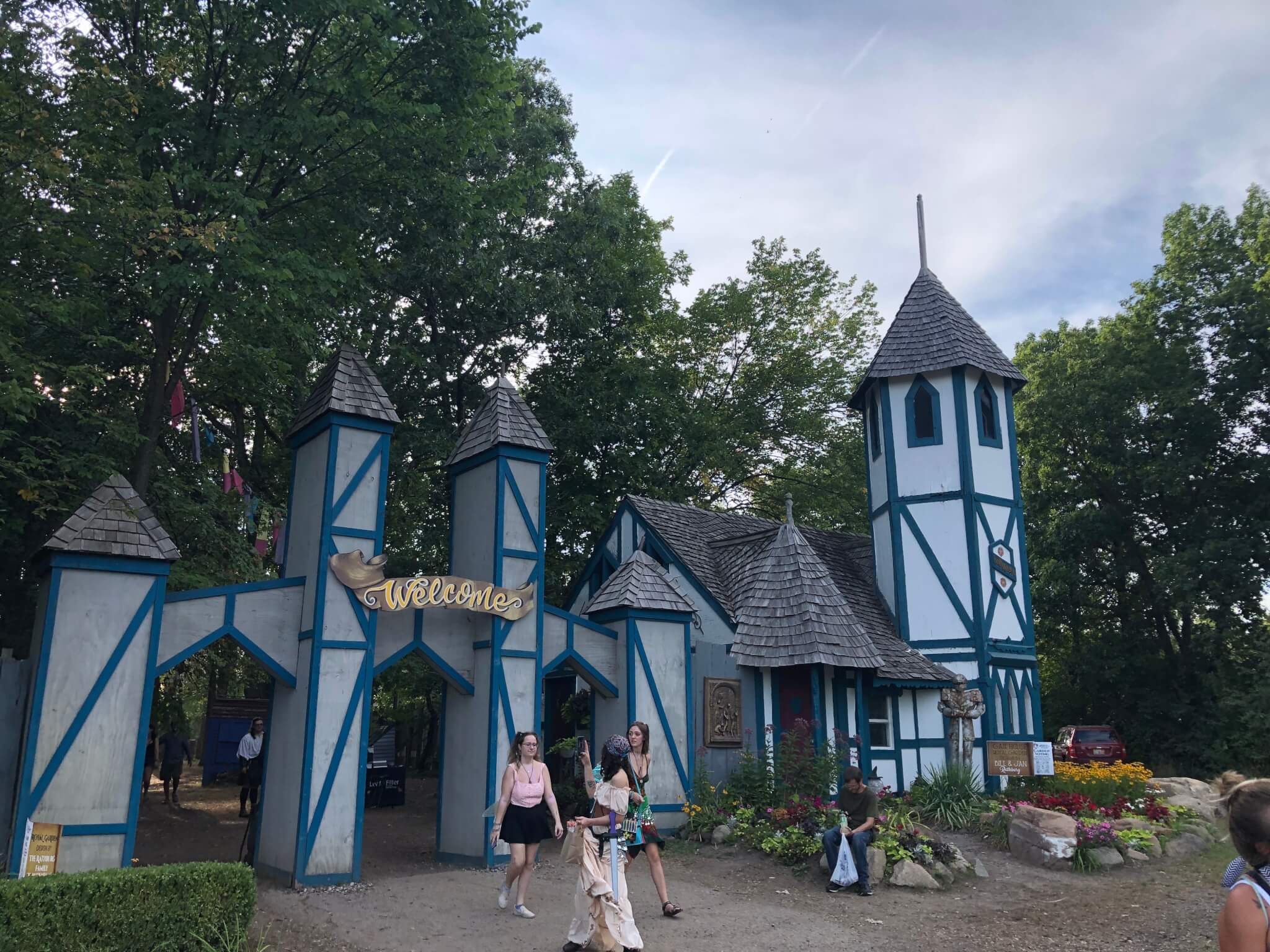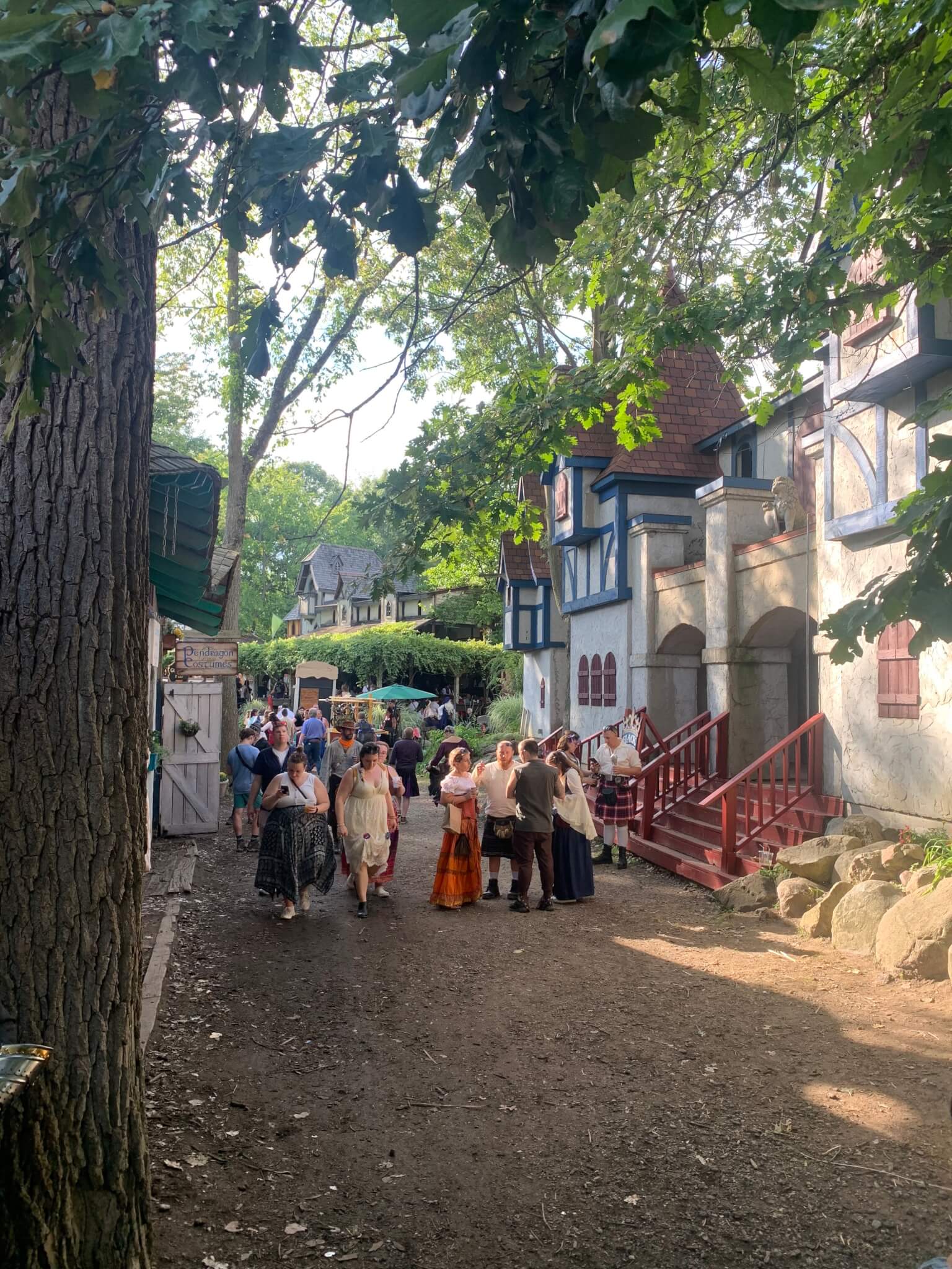 Following signs through the woods, fair goers chat excitedly as we all walk single file down a narrow path…many of us in questionable footwear. There are costumed villagers, noblemen and noblewomen, wizards, and creatures both vaguely historical and entirely fantastical. There are also young adults, seniors, families with kids, and teenagers, all of us heading toward a sound: the distant cry of bagpipes.
