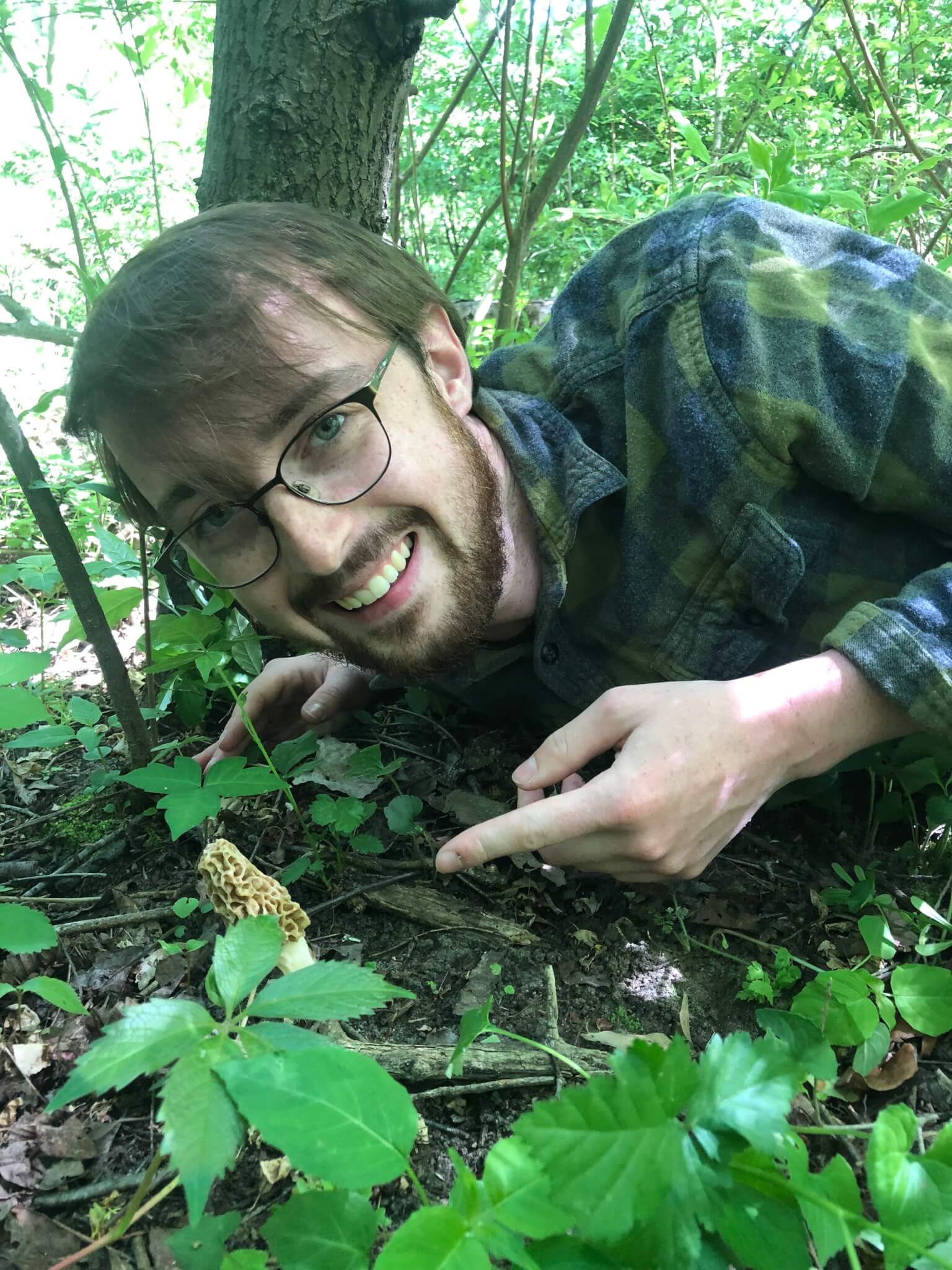 That’s when it happens. Very casually growing just off the trail, a morel reaches out to me. I’m surprised Angelina didn’t see it first (maybe she did) but I’m overjoyed to take the win. I hold my face to the dirt and smile as Angelina takes my picture, and then I cut the mushroom from the ground. It even has a hollow stem—a true morel; a tiny jackpot from nature.